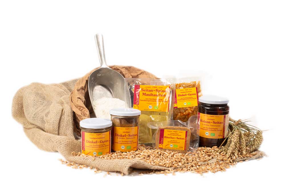 biologischen Seitan-Produkten aus Weizen, Dinkel und auch aus dem Ur-Getreide Kamut her.